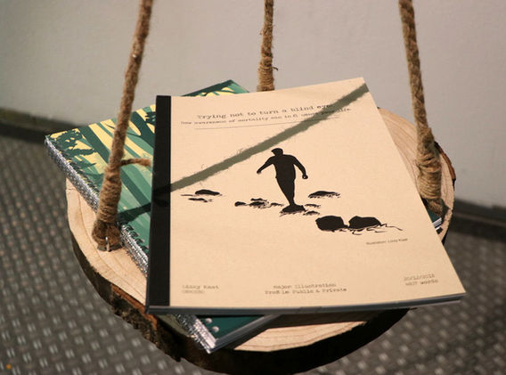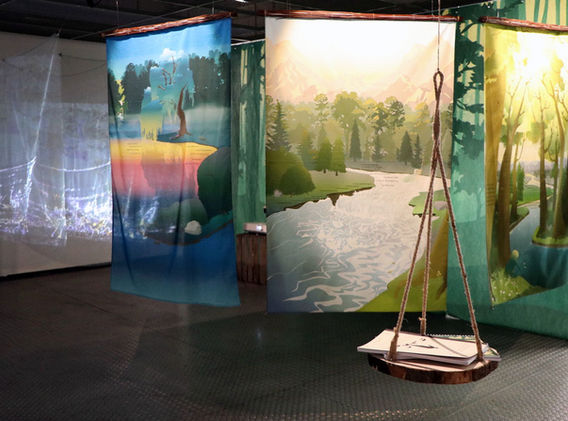 Main Illustrations: print on fabric (different materials) 90X150cm, Film: projection on fabric 4 pieces (organza) 150X150cm, Background illustration of forest: print on fabric 260x500cm, added sound effects of birdsong and a babbling brook.